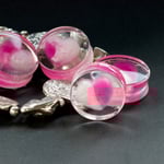 Translucent round plugs in a double flared style with a split heart (pink/white) set in the centre.