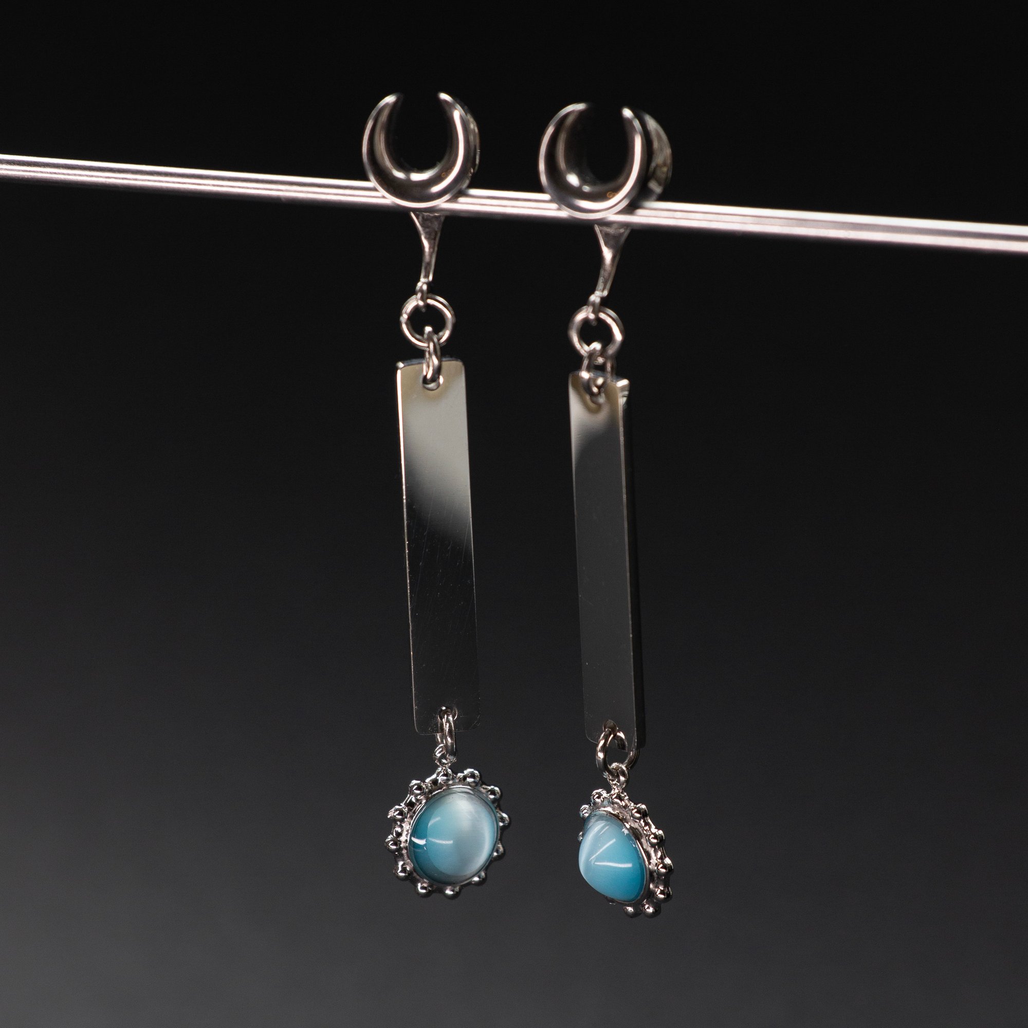 The perfect summer dangle plugs, can be dressed up or down. Featuring a blue cat eye stone.