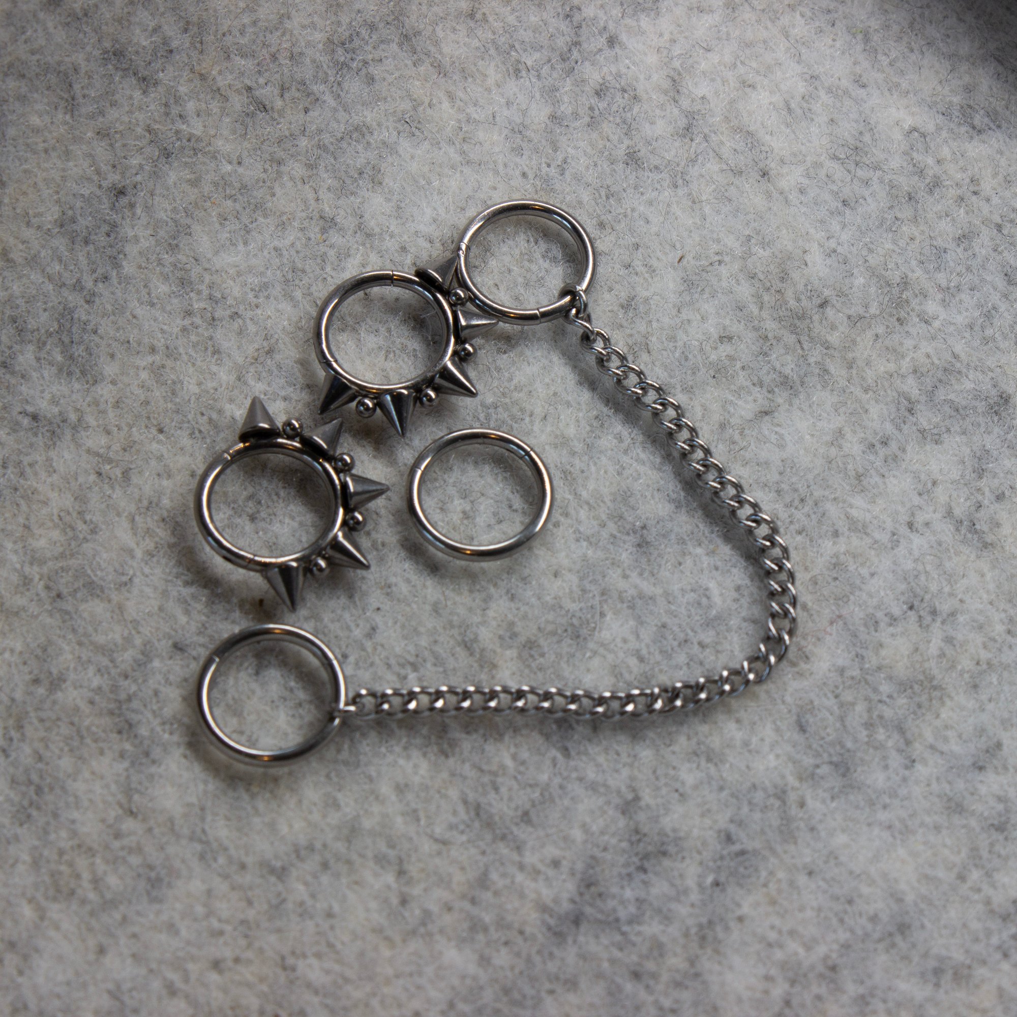 In a stack of 5, 3 plain hinged segment rings, 2 hinged spiked segment rings with a chain add on. 16g (1.2mm) with an 8mm diameter. Only available in silver at this time. For more stacking options, see my other listings.